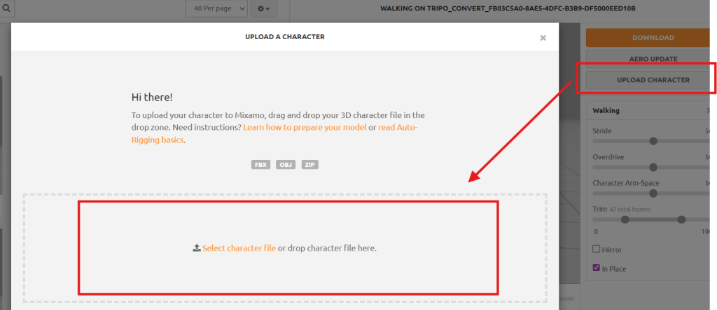 - MIXAMOからダウンロードしたモデルをクリック