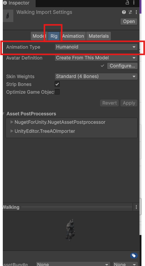 - Animation Typeを「Humanoid」に変更