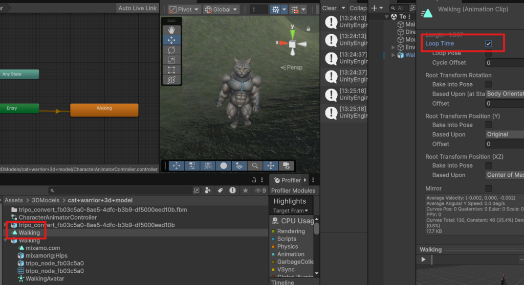コピーしたアニメーションクリップアセットは名前を変更したりLoopTime設定でLoop再生できるようになります。